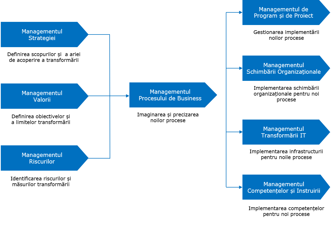 - Managementul Strategic: definește scopurile și obiectivele transformării;