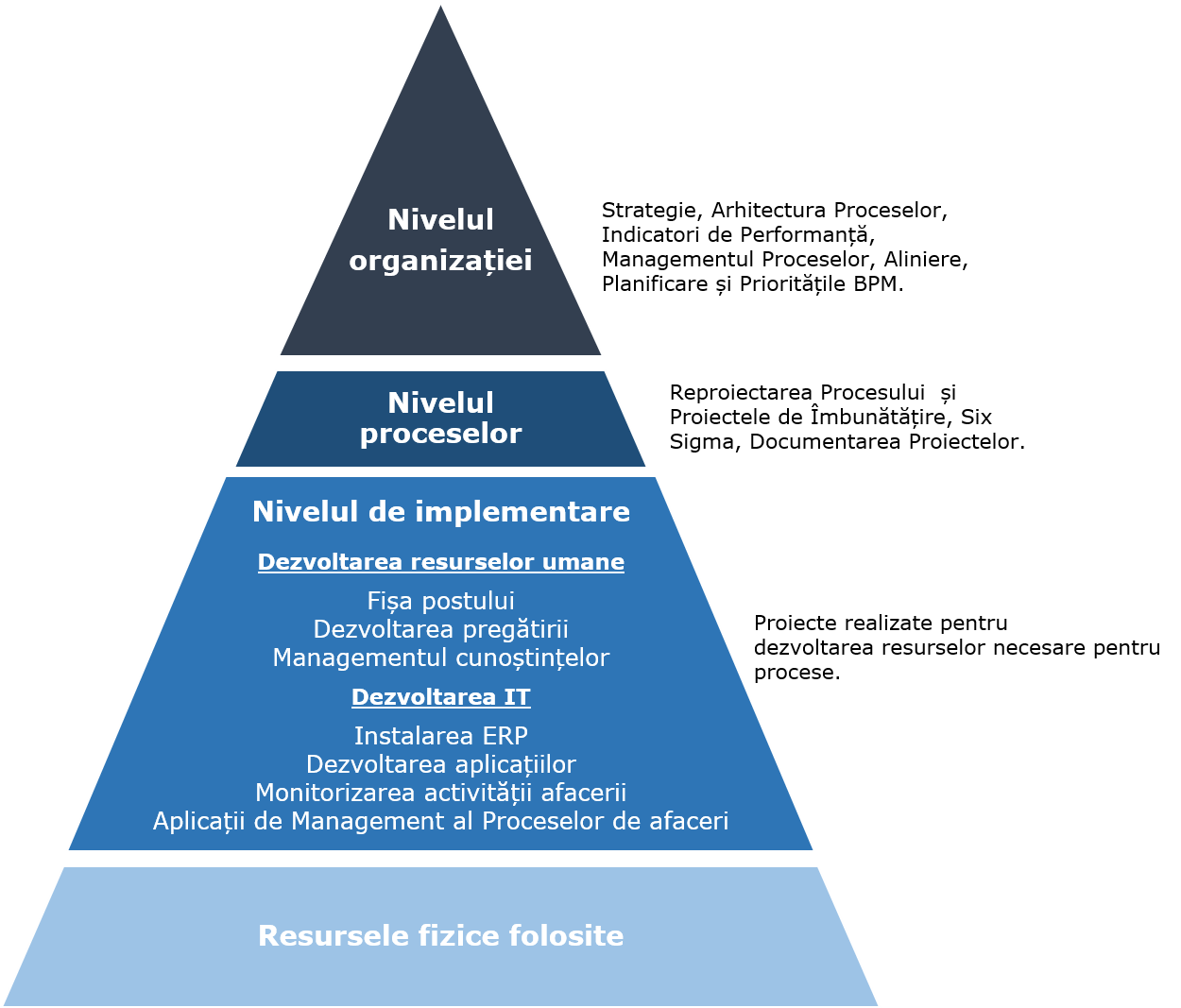 - Nivelul organizațional (vârful piramidei): procesele sunt coordonate la nivelul întregii organizații, se aliniază procesele cu strategia generală a afacerii, se definește sistemul de conducere în cadrul managementului proceselor;
